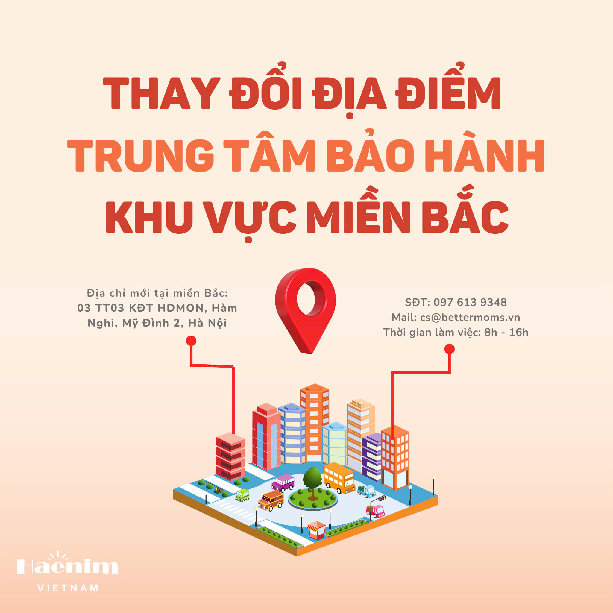 Haenim Việt Nam xin gửi thông báo tới ba mẹ về việc thay đổi địa điểm Trung Tâm Bảo Hành